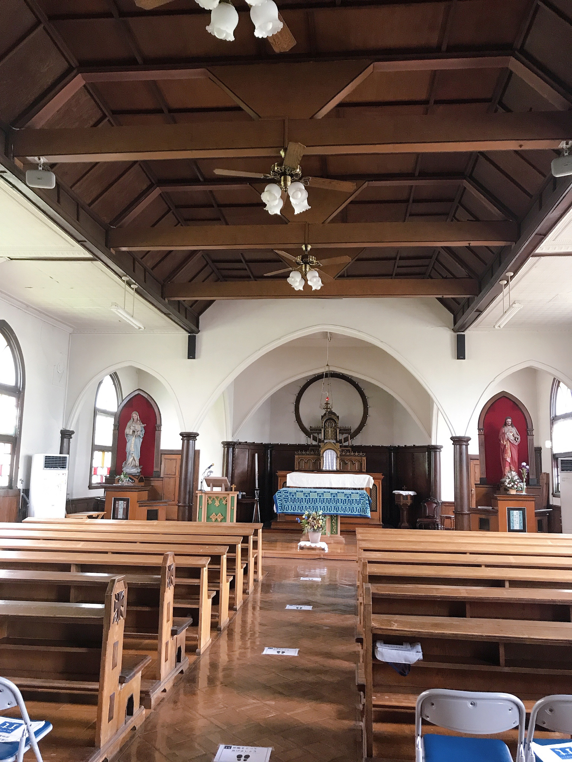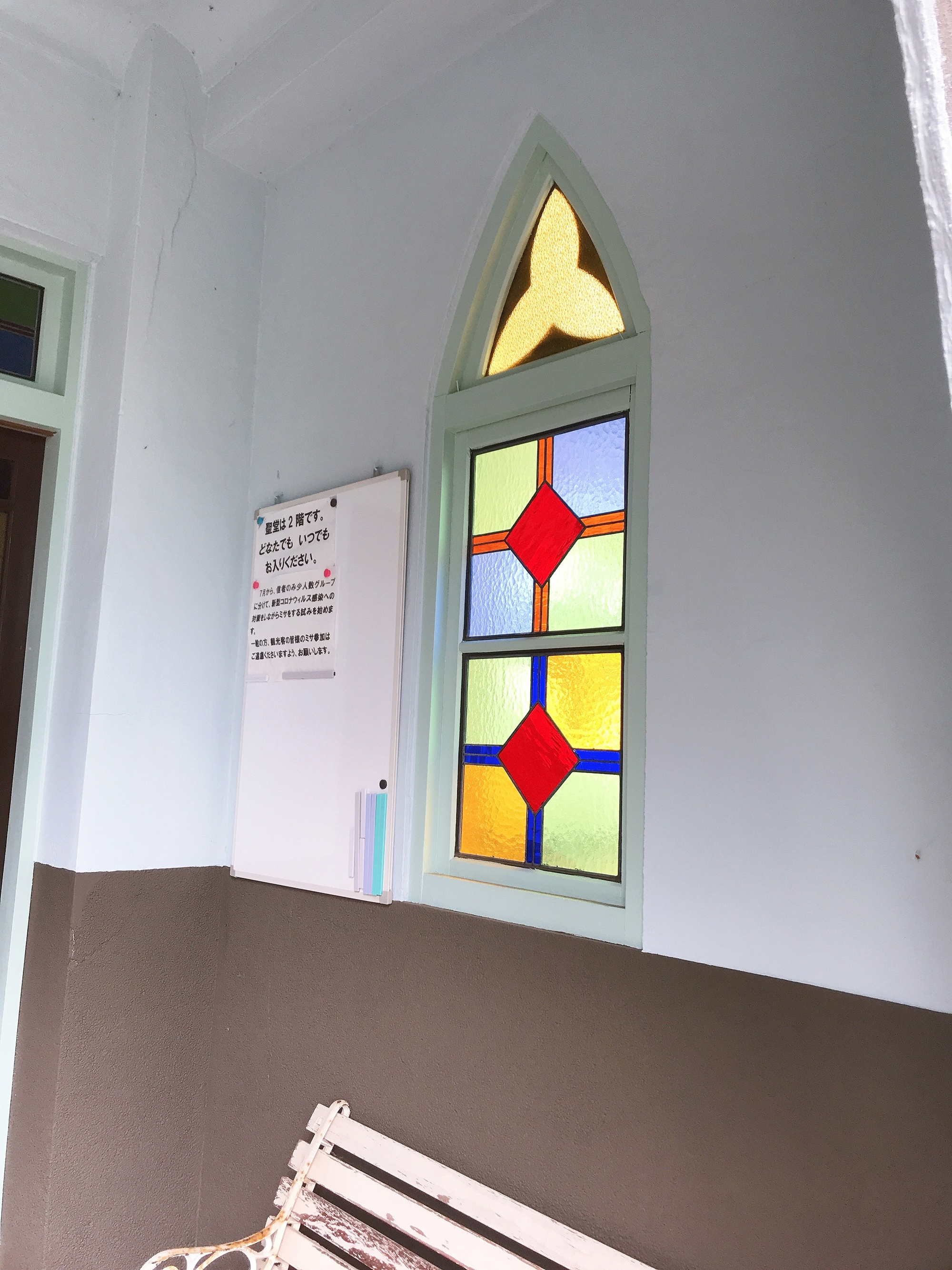 The exterior of the cathedral carries an air reminiscent of medieval European church architecture. Its red pointed roofs and octagonal turrets overlap rhythmically, creating a charming and unique design where Romanesque and Gothic elements naturally meld. It is said that the design was influenced by Oura Church in Nagasaki, exuding elegance within its heavy, stone-like presence. Upon opening the doors and stepping inside, the first thing to catch the eye is the soft light streaming through the stained glass. The large windows, which have remained since the original construction, feature simple geometric patterns. Yet, the layers of various colored glass create a rich variety of expressions. Some of the pink, yellow, and green glass is said to be of a type no longer produced in Japan, and the light reflected on the white plaster walls quietly colors the cathedral across generations. One of the features of Tomioka Cathedral is that it is open to everyone, not just believers. Even those visiting for sightseeing can spend a quiet moment here without hesitation. Furthermore, in a rare move, photography is permitted inside the chapel, making it a significant draw for those wishing to enjoy the beautiful, light-filled space at their own pace.