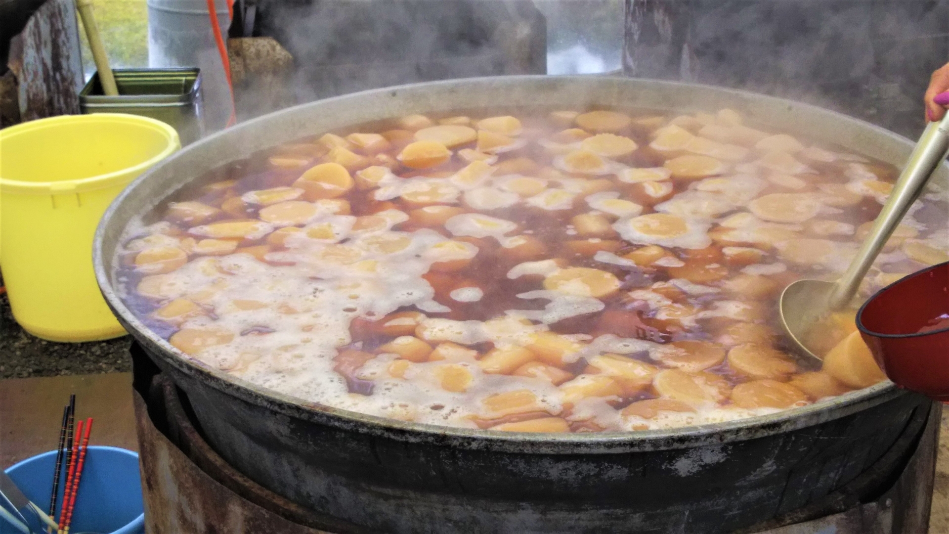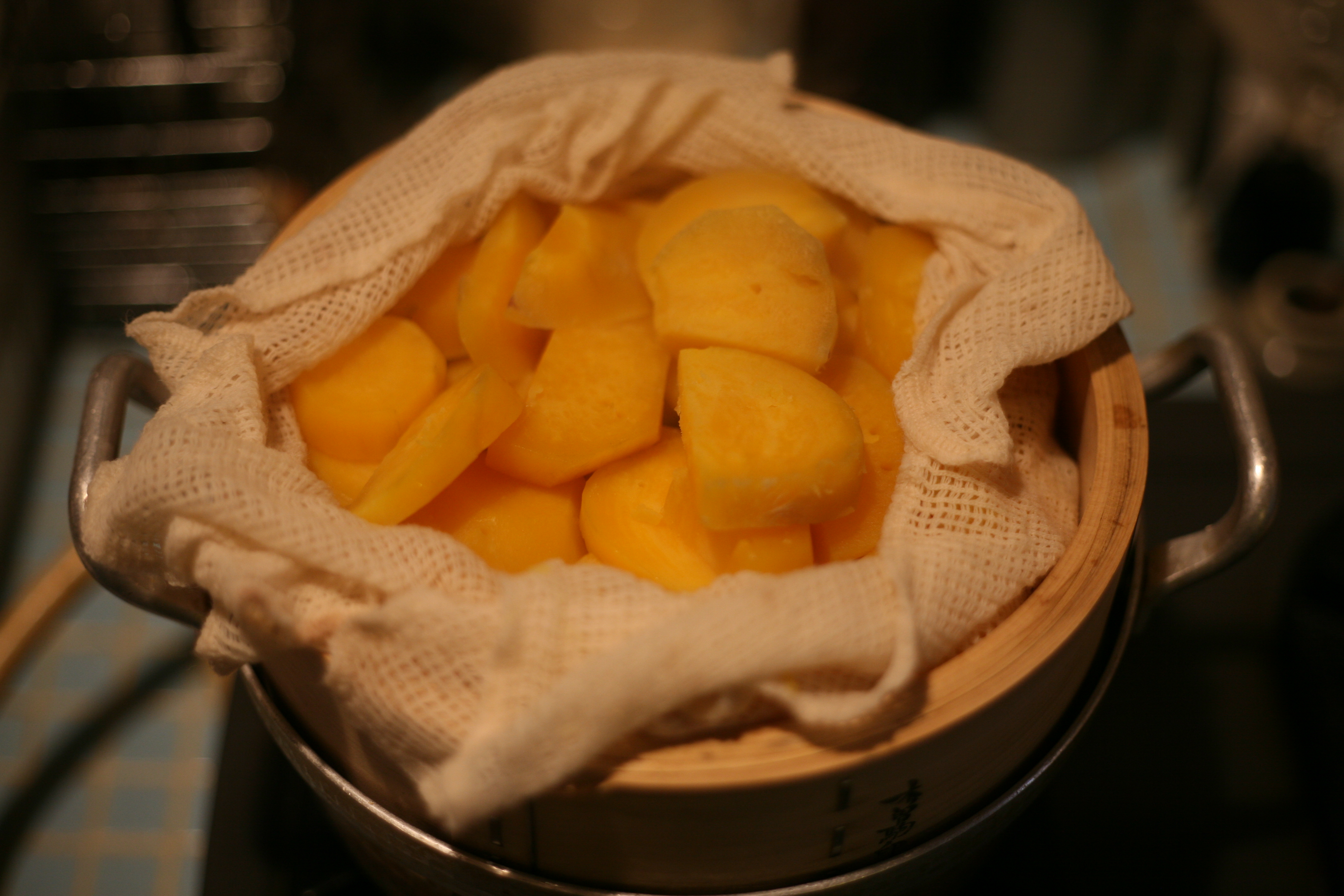 When the water comes to a boil, place the sweet potatoes wrapped in a cloth in the Chinese Seiro and steam over medium heat for 20 to 30 minutes until the sweet potatoes are soft.