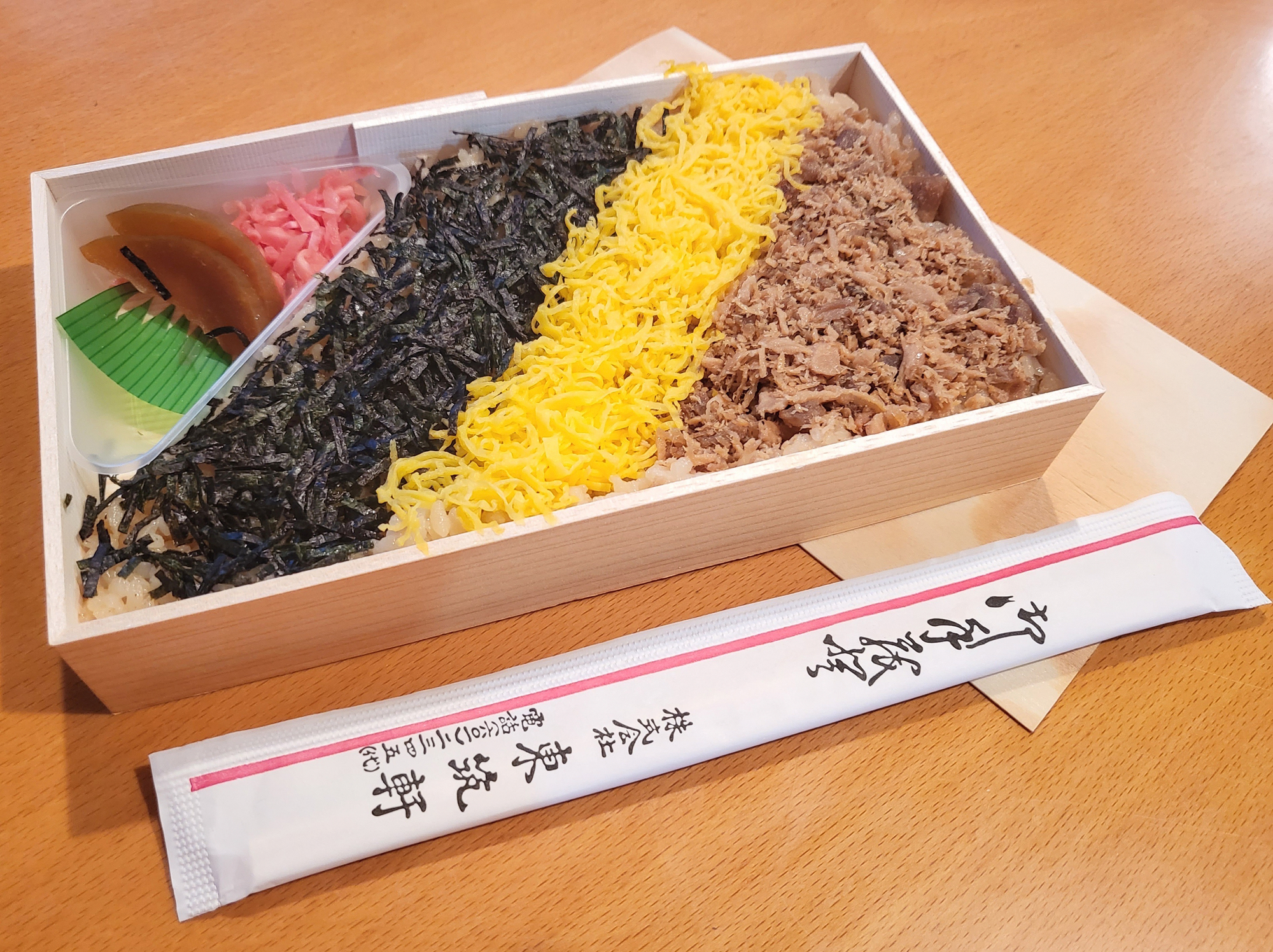 The wooden folded box is an ideal container for ekiben because its antibacterial properties keep food fresh and absorb moisture from the rice.
