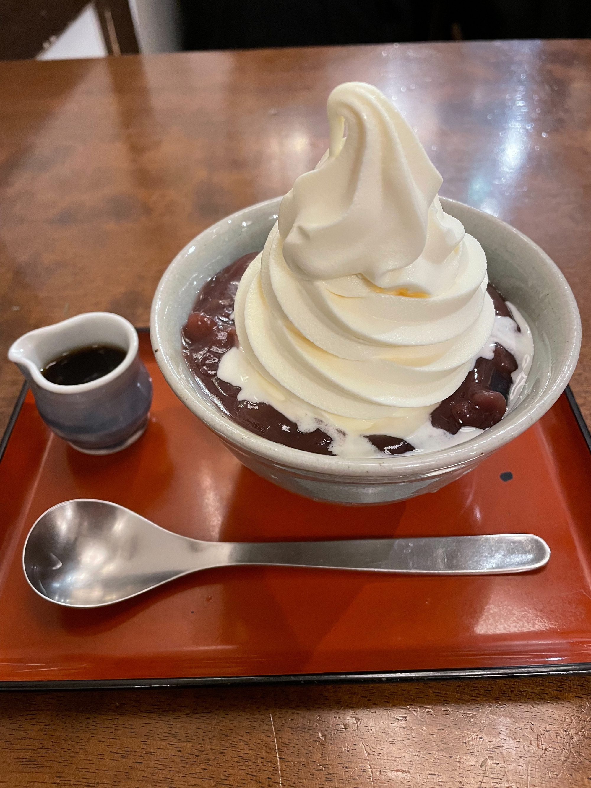 My favorite dish at Okame is the Zao Anmitsu. It is made of agar agar topped with red bean paste and soft-serve ice cream reminiscent of the ice on the Zao mountain range. The key point is that the red bean paste is not azuki but kintoki-mame (red kidney bean paste). Kintoki-mame contains three times as much polyphenol as black beans and 1.5 times as much dietary fiber as soybeans. This is ideal for removing active oxygen, improving the intestinal environment, and strengthening the immune system. The beans are larger in size than azuki beans, so they have a strong presence and a simple yet robust flavor.