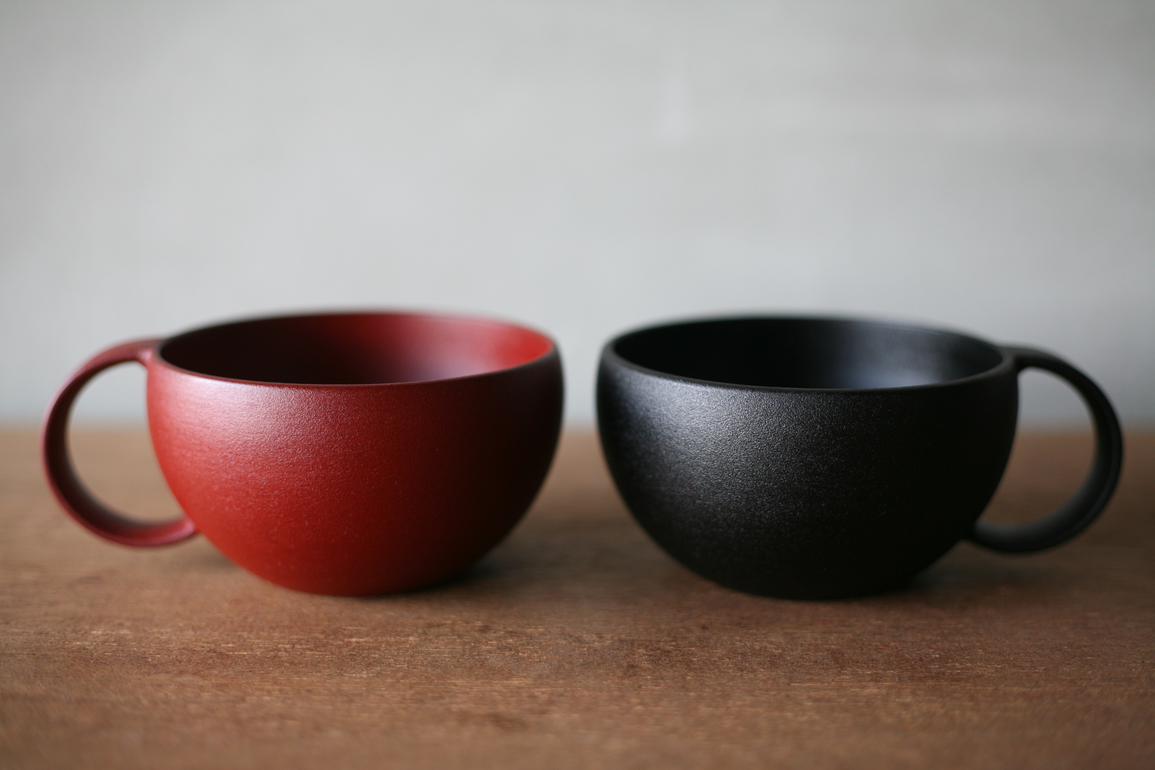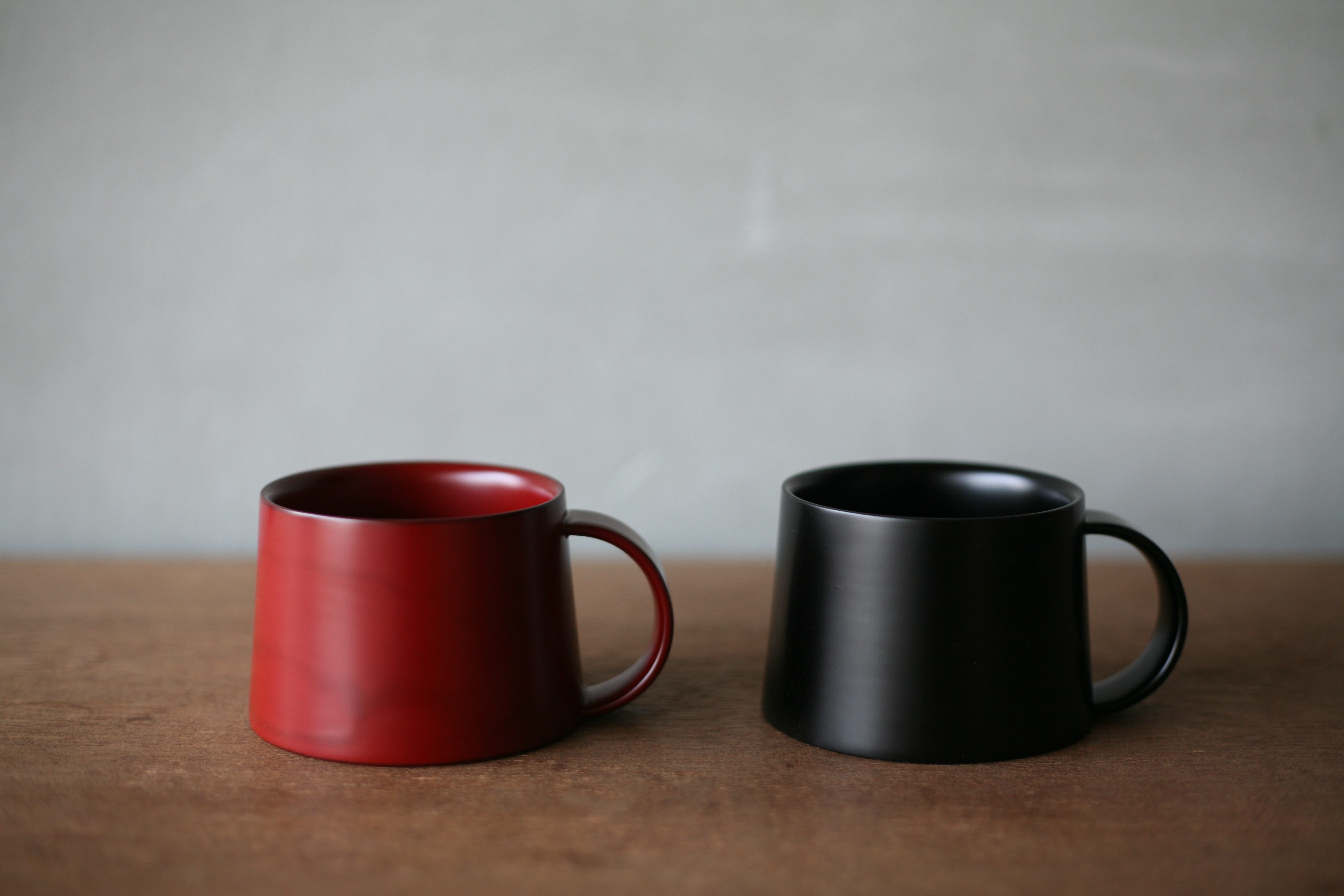 The matte mugs are made by Wajima Kirimoto's original "Makiji Technique." After the natural wood has been dressed with cloth and primed, Wajima jinoko is used again near the surface, and lacquer is applied over and over again. This gives the surface hardness and resistance to abrasion and scratches, even when using a metal spoon.