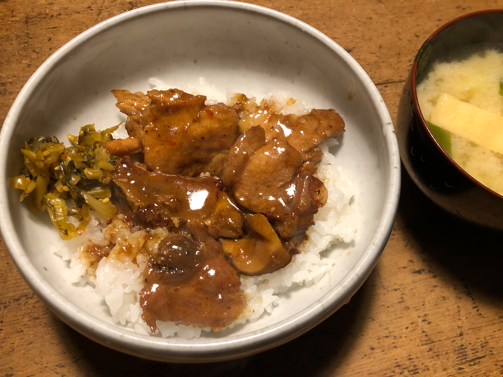 The accompaniments include a flavor-soaked boiled egg, crunchy takuan pickles, and colorful greens. The combination of juicy, tender pork and rice soaked in the sauce is irresistibly delicious. It's a simple yet deeply satisfying bowl that brings a quiet sense of happiness.